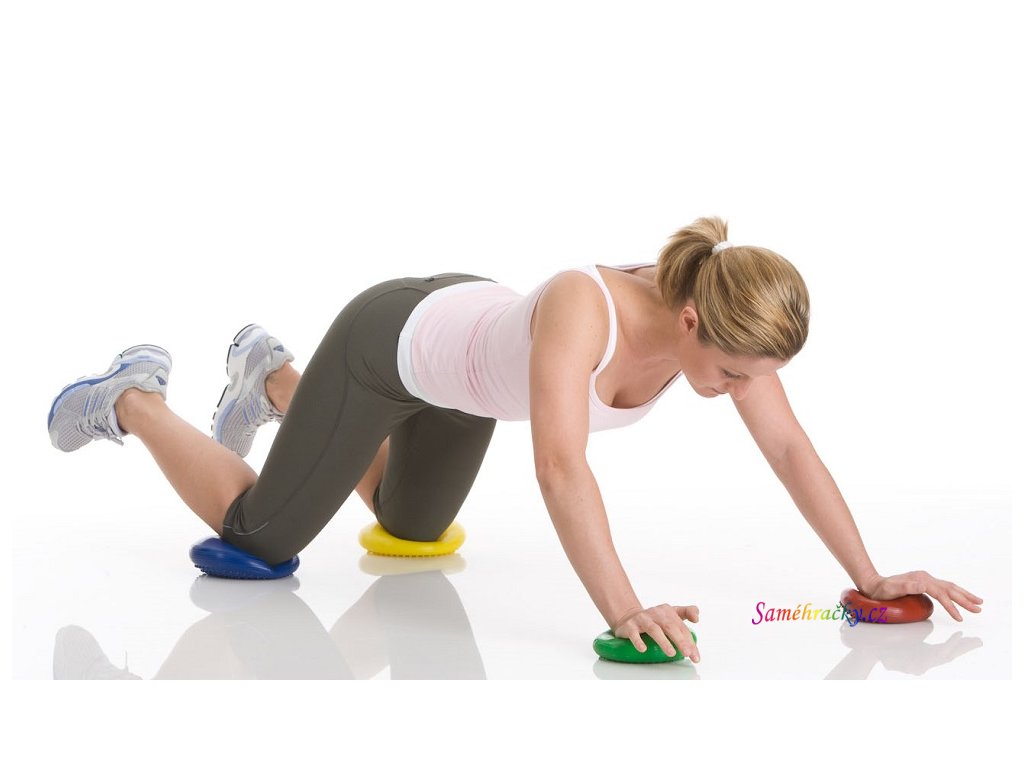 V balení jsou 4 balanční podložky - červená, modrá, zelená a žlutá.