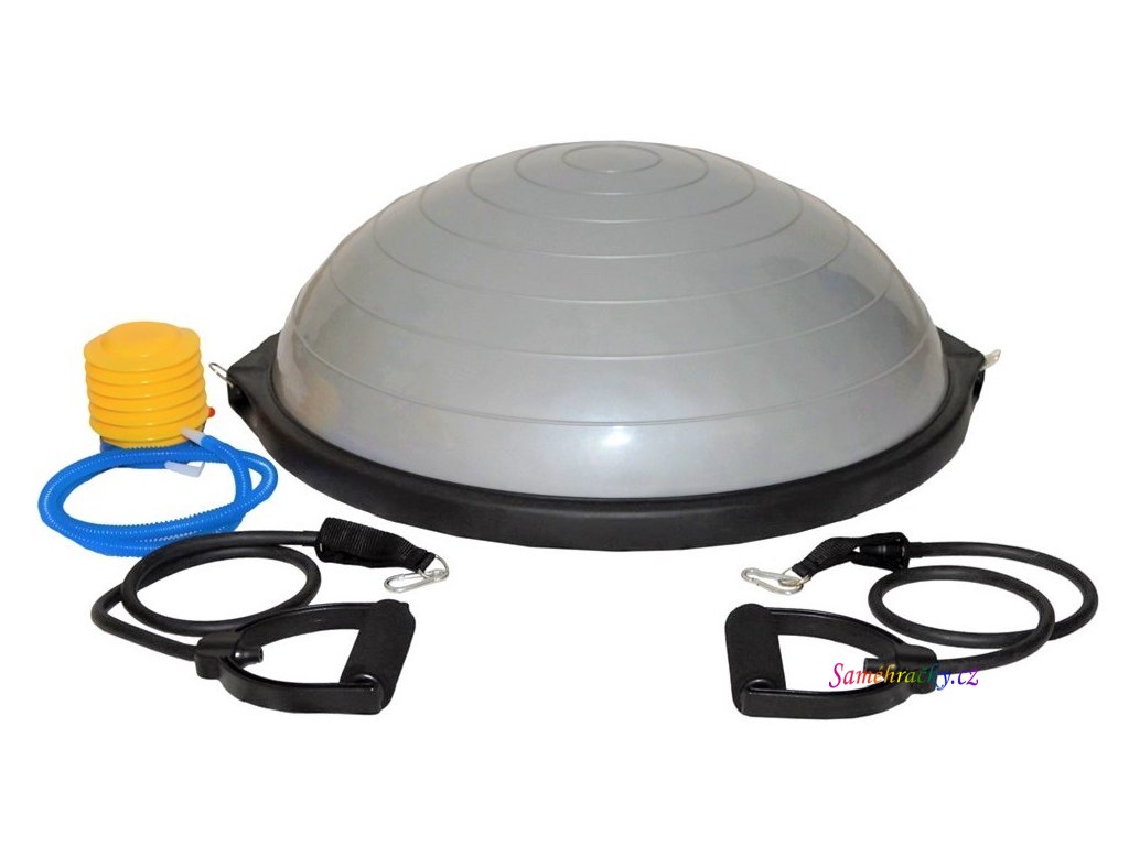 Cvičební balanční vzduchová podložka Dynaso TOP bosu s pevnou plastovou základnou - balanční podložka ve tvaru polokoule je ideální pro fitness, aerobik, fyzioterapii, rehabilitaci, rekonvalescenci a je vhodný i na cvičení doma. Nestabilní plocha přispívá ke zlepšení koordinace a rozvoji stability, napomáhá k odstranění bolesti zad, posílení břišních svalů a komplexně posiluje svaly celého těla. Cvičení rovněž zapojuje hluboký stabilizační systém trupu a páteře. Aktivuje hluboko uložené svaly, které se často při cvičení nezapojují. Pomocí přiložených gumových expandérů procvičíte svaly horních i dolních končetin.