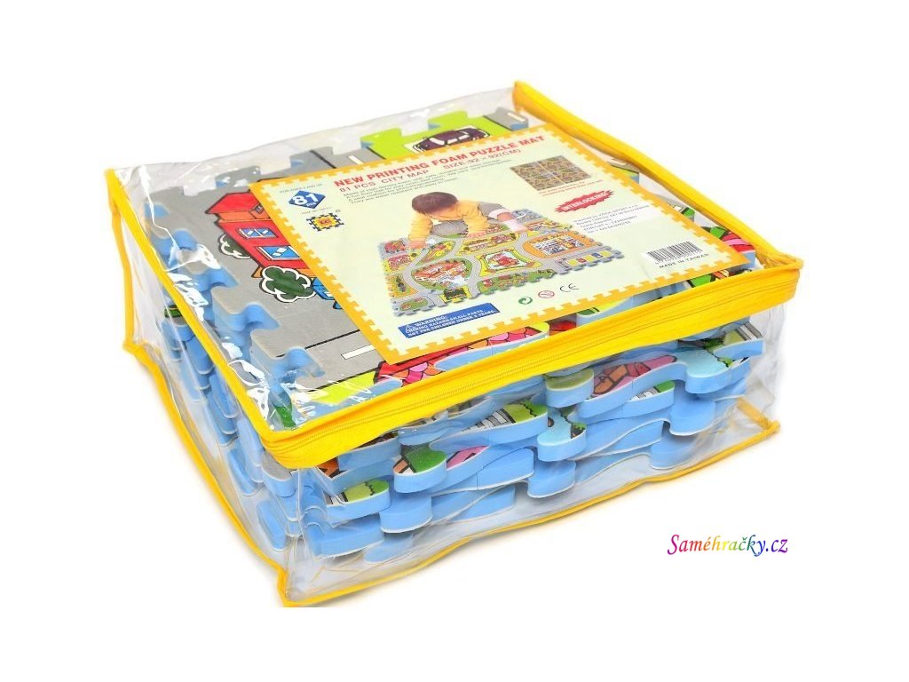 Kvalitní celopotištěné pěnové podlahové puzzle zobrazuje Mapu města. Po skládání puzzle vznikne obrázek města s motivem klikaté silnice, křižovatek s obchody a nechybí ani hřiště, nemocnice nebo parkoviště. Děti mohou po městě jezdit s autíčky podle vlastní fantazie. S velkými dílky se lehce manipuluje, dílky přesně zapadají do sebe a výborně drží. Živé příjemné barvy přitahují dětské oči a povzbuzují k zábavě a učení.