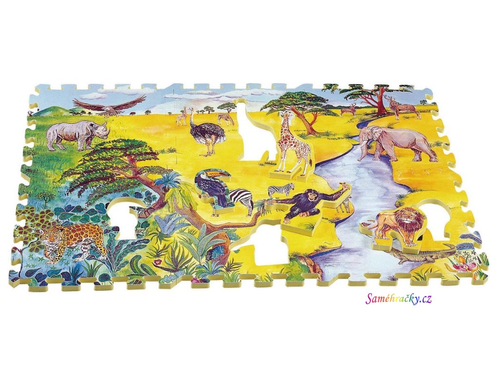 Kvalitní celopotištěné pěnové podlahové puzzle s motivem zvířat Africké savany. V balení je šest desek 30 x 30 cm a 12 zvířátek, které se dají vyjmout ze skládačky. Živé příjemné barvy přitahují dětské oči a povzbuzují k zábavě a učení. Skládání ovlivňuje vývoj dítěte, rozvíjí manuální dovednosti, stimuluje kreativitu a učí soustředění a trpělivosti. Výrobek splňuje požadavky EU, certifikace EN71.