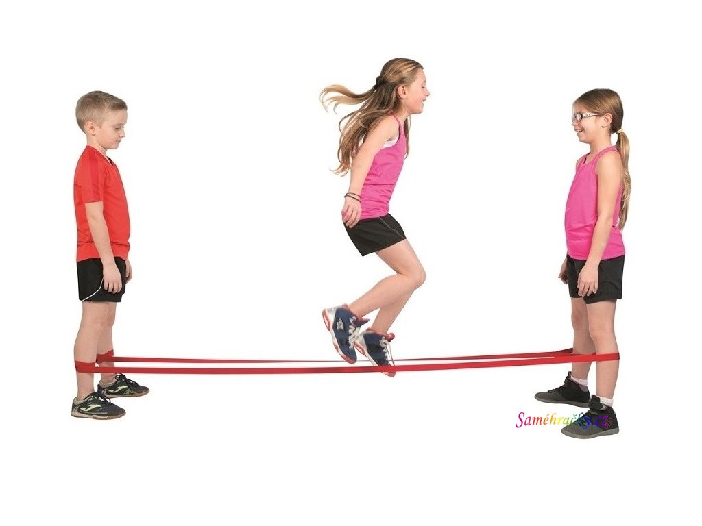 Se skákací gumou si užijí spoustu legrace nejen děti, ale i dospělí. Dvě děti se postaví čelem k sobě, mírně se rozkročí a elastickou gumu si jednoduše upevní kolem kotníků. Třetí dítě stojí mimo prostor gumy a začne skákat. Postupně se všichni vystřídají a pokud vše zvládnou posunou gumu nahoru. Dětí se může účastnit libovolné množství. Skákat přes gumu můžete na hřišti, v tělocvičně nebo doma na zahradě. Guma je plochá a při skákání dobře drží na noze.