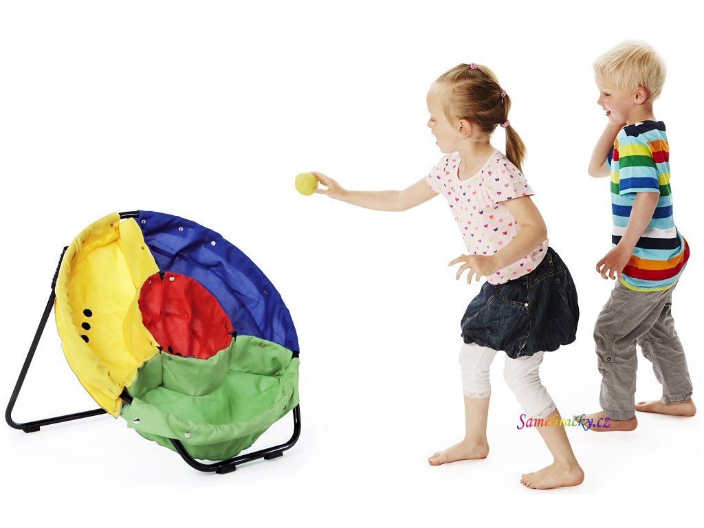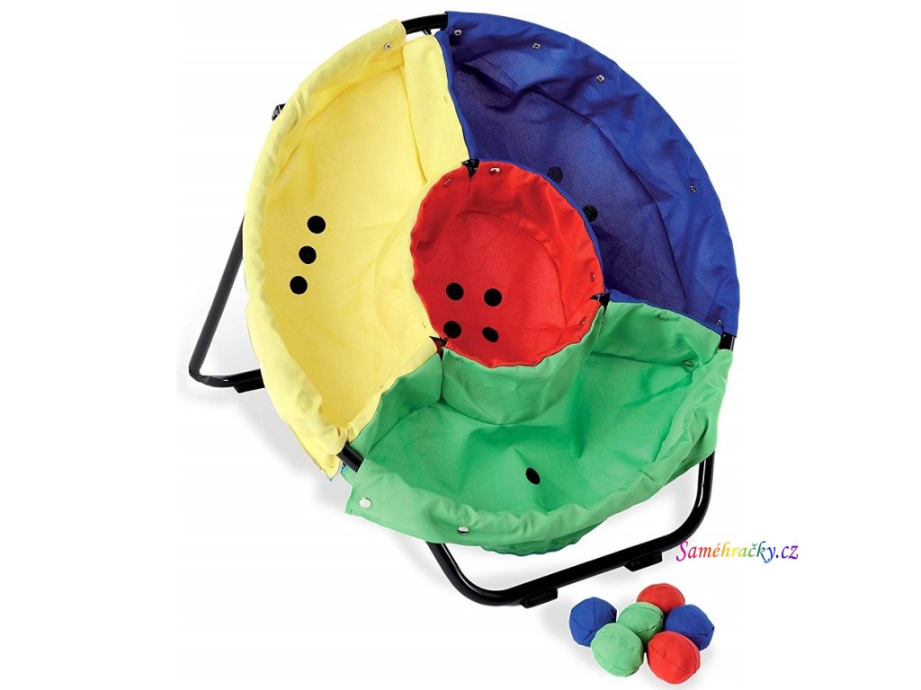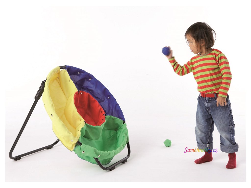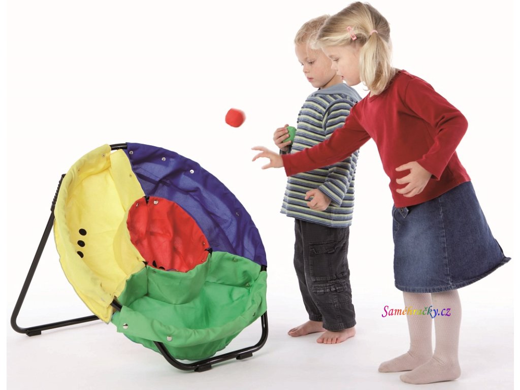 Terč na měkké molitanové míčky má jednoduchou a funkční konstrukci z kvalitního materiálu a vyniká elegantním designem. Je to velký stojan s polyesterovými sáčky ve čtyřech různých barvách. Jednotlivé vaky terče jsou bodově označeny a děti tak mohou mezi sebou soutěžit. Stojan je dodáván se šesti měkkými žonglovacími míčky. Terč má gumové nožičky na ochranu podlahy a pro zabránění klouzání.